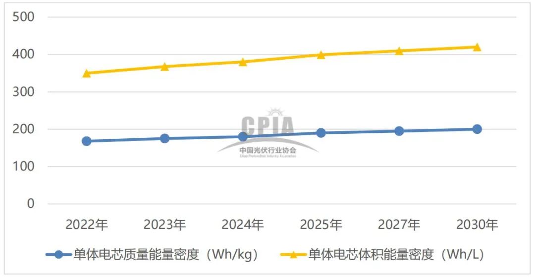 2022-2030年我国锂电储能单体电芯质量/体积能量密度变化趋势