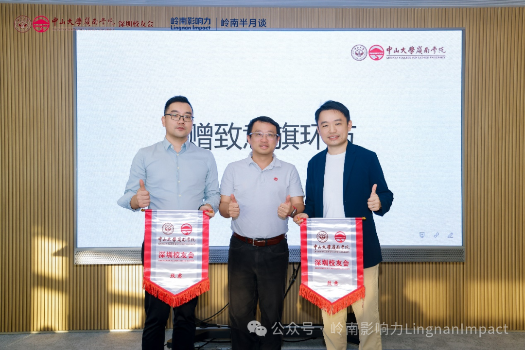 问答环节结束后,由中山大学岭南学院深圳校友会执行副会长、地产基建分会秘书长02级李浩华校友为分享嘉宾李焕初校友和张仁勋校友赠送校友会致意旗,感谢两位嘉宾在百忙之中对校友会活动的鼎力支持!